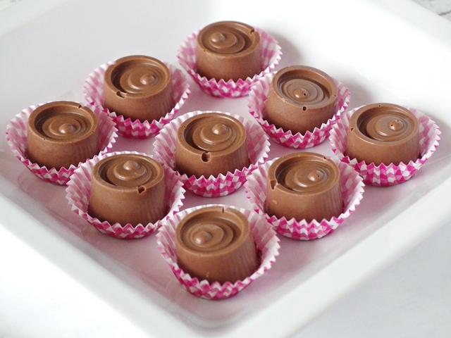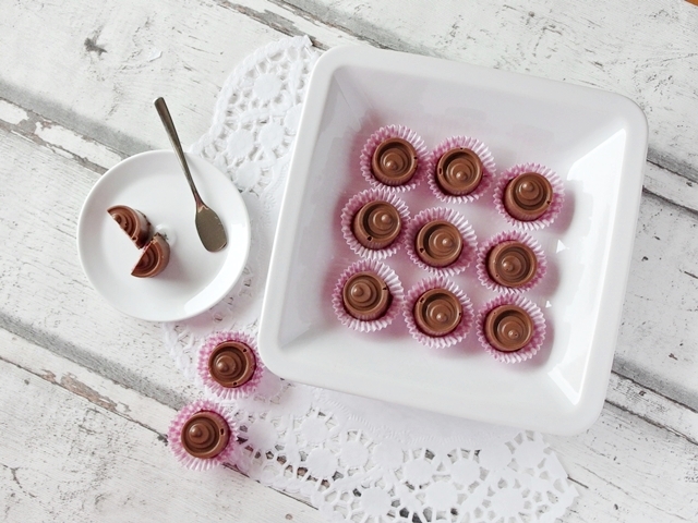 2. Mit einem kleinen Löffel etwas Schokolade in die Pralinenförmchen geben und am Rand hochstreichen. Für circa 10-15 Minuten in den Kühlschrank geben (je nach Kühlschranktemperatur dauert es länger oder kürzer).