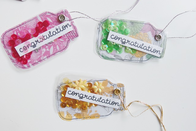 Das “Einmachglas” aus dem Summertime Charm Stempelset auf euer Motivpapier stempeln, ausschneiden und erstmal beiseite legen. Das Motiv dann noch auf etwas stärkere Pappe stempeln und ebenfalls ausschneiden. Dies ist dann eure Vorlage, um mit dem Fuse Tool die schöne “Einmachglas”-Form auf die Klarsichtfolie zu bekommen (Anleitung zum Fuse Tool liegt der Verpackung bei). Den “Deckel” des Einmachglases dabei zunächst aussparen, um die Pailletten und einen Schriftzug (meiner ist aus dem Happy Wedding Stempelset) hineinzufüllen. Anschließend die Klarsichtfolie komplett mit dem Fuse Tool schließen. Zum Abschluss müsst ihr nur noch das Motivpapier sowie die fertige Klarsichtfolie lochen,  Ösen (wenn ihr mögt, geht auch ohne) anbringen und ein schönes Geschenkband dranhängen 🙂 Fertig!